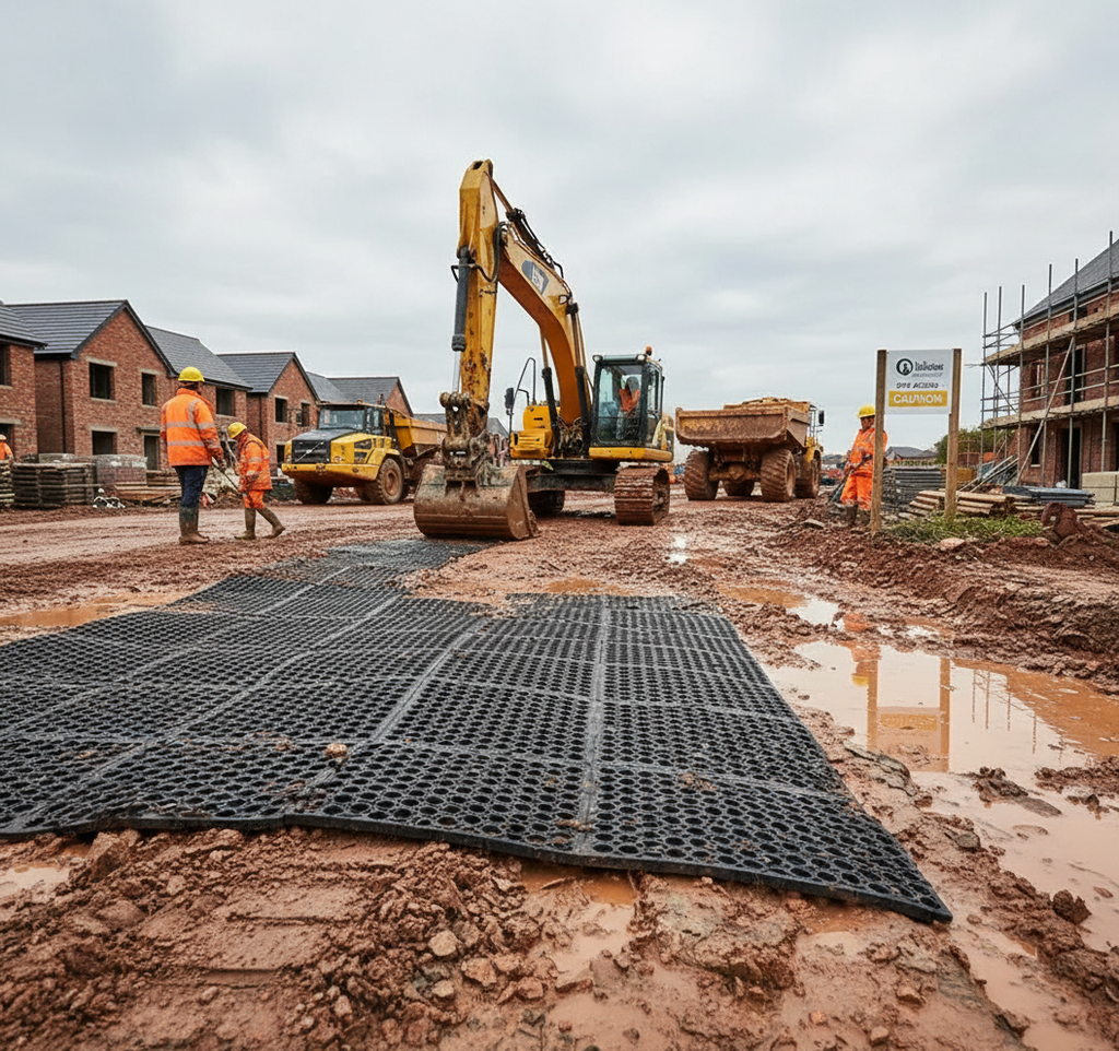 Every builder knows the problem: vehicles and foot traffic destroy client gardens before the job even starts. Our construction access mats distribute weight across the surface, preventing ruts, mud, and grass damage. After the job, remove the mats and leave the lawn exactly as you found it.